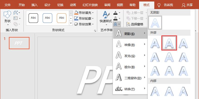 第三步:选择文本,点击【格式】-【艺术字样式】-【文字效果】按钮,在弹出的菜单中选择”阴影”-“偏移-下“效果,如下图所示。