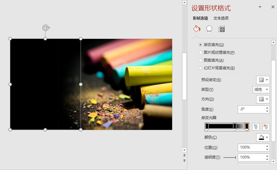 (1)在左侧绘制一个矩形,打开“设置形状格式”任务窗格,设置渐变填充,填充颜色为黑色,将第3个停止点的透明度设置为100%(具体颜色和透明度可根据实际情况而定)。
